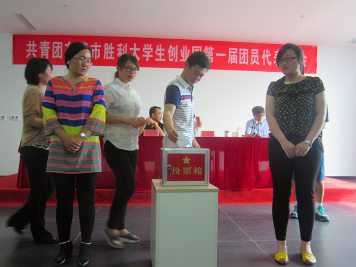 上午9时,大会在雄壮的《国歌》声中开幕。大会严格按照《共青团东营市胜利大学生创业园第一次代表大会选举办法》要求,通过民主投票,选举产生了共青团东营市胜利大学生创业园第一届委员会。石硕峰同志当选为共青团东营市胜利大学生创业园第一届委员会书记,常刚、邵广瑞同志当选为副书记。石硕峰、常刚、邵广瑞、刘祥庆、孙帅、胡基恒、冯磊、肖禹成、朱路军当选为共青团东营市胜利大学生创业园第一届委员会委员。