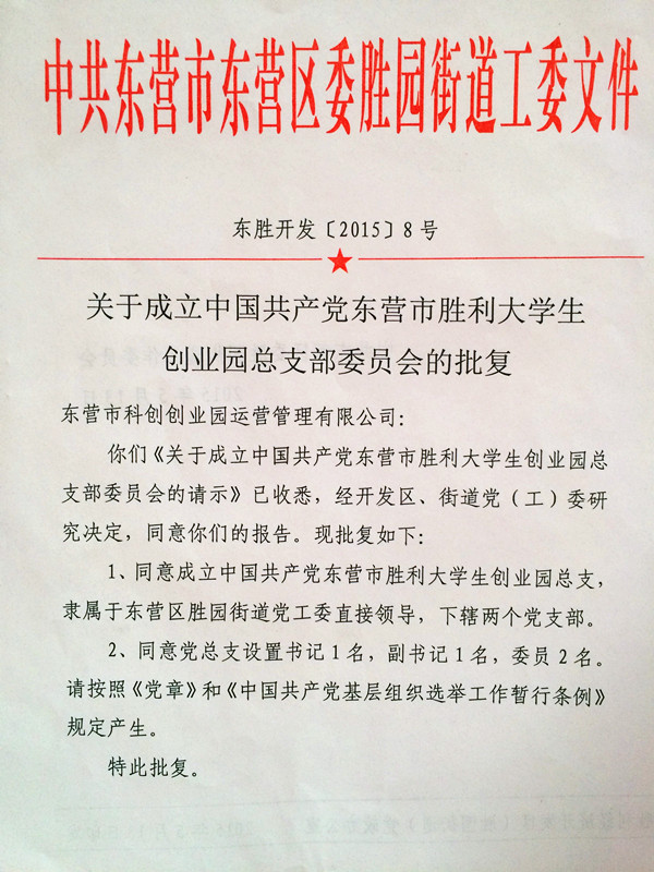 经开发区、街道党(工)委研究决定,同意成立中国共产党东营市胜利大学生创业园总支部委员会。