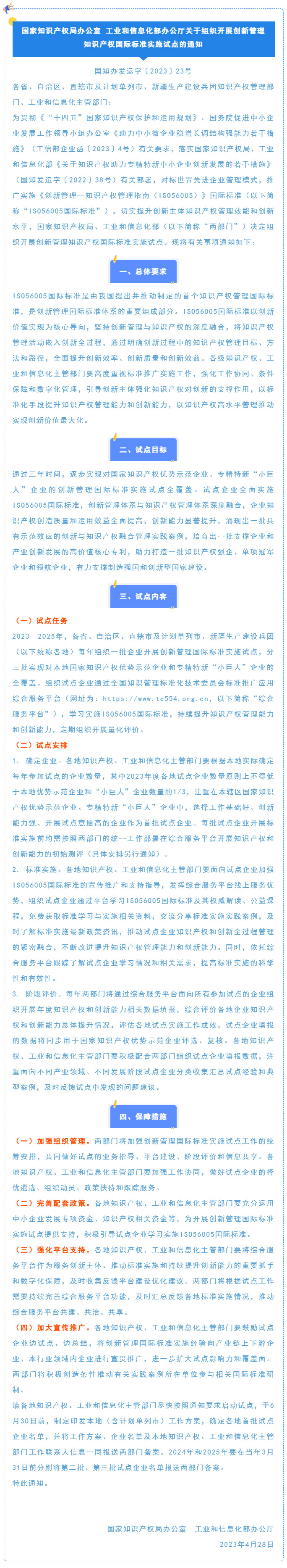 【政策资讯】关于组织开展创新管理知识产权国际标准实施试点的通知