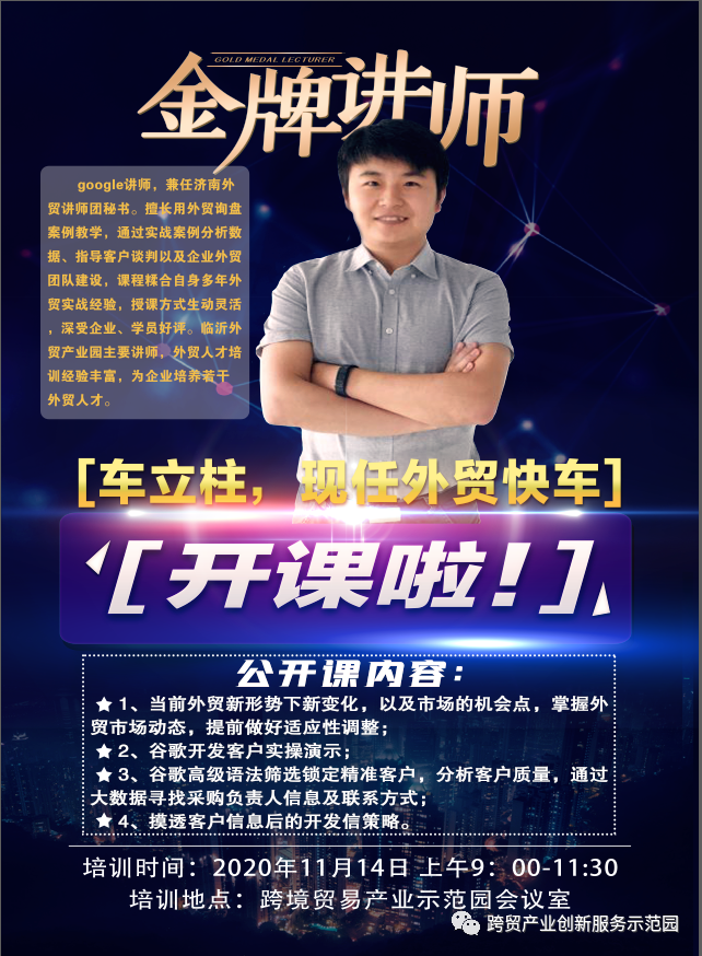 为帮助园区企业了解当下外贸新形式新变化,掌握外贸市场新动态,提前做好适应性调整,跨贸产业创新服务示范园特邀请外贸快车Google讲师前来授课,为大家讲解新形势下的市场机会点、谷歌客户开发实操及客户开发策略等内容。具体事项通知如下: