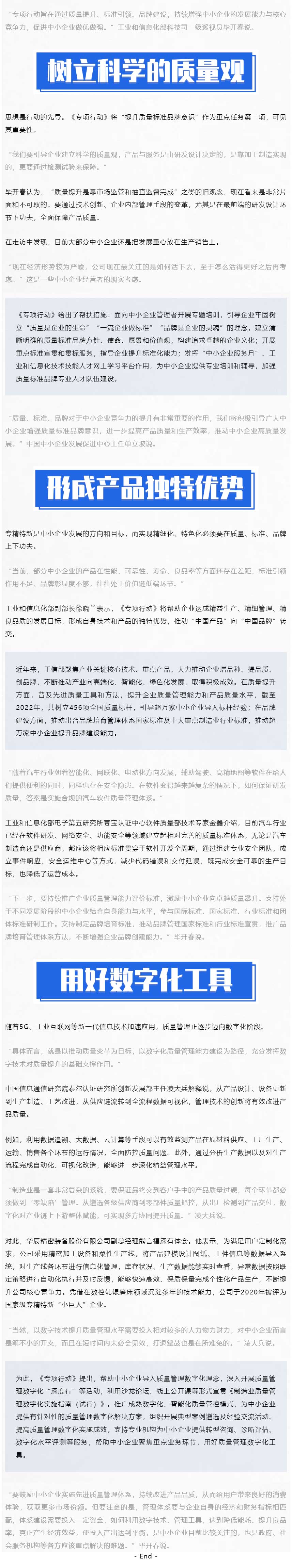 前不久,工业和信息化部等九部门印发了《质量标准品牌赋值中小企业专项行动(2023—2025年)》(以下简称《专项行动》)(点击查看具体内容)。《专项行动》提出,到2025年,中小企业质量标准品牌意识显著增强,综合效能不断提高,质量标准品牌对中小企业生存发展贡献持续加大,有力推动中小企业专精特新发展。