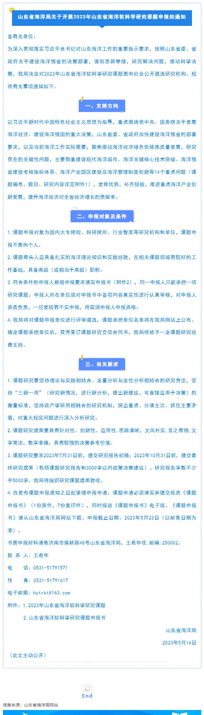 【项目申报】关于开展2023年山东省海洋软科学研究课题申报的通知